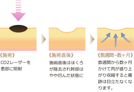 削るタイプのレーザーを照射しほくろを除去する治療法です。 照射範囲以外に傷が出来ることはなく、傷の治りも早いです。 一度に複数のほくろ除去を希望される方、人に気づかれずほくろ除去を行いたい方におススメです。